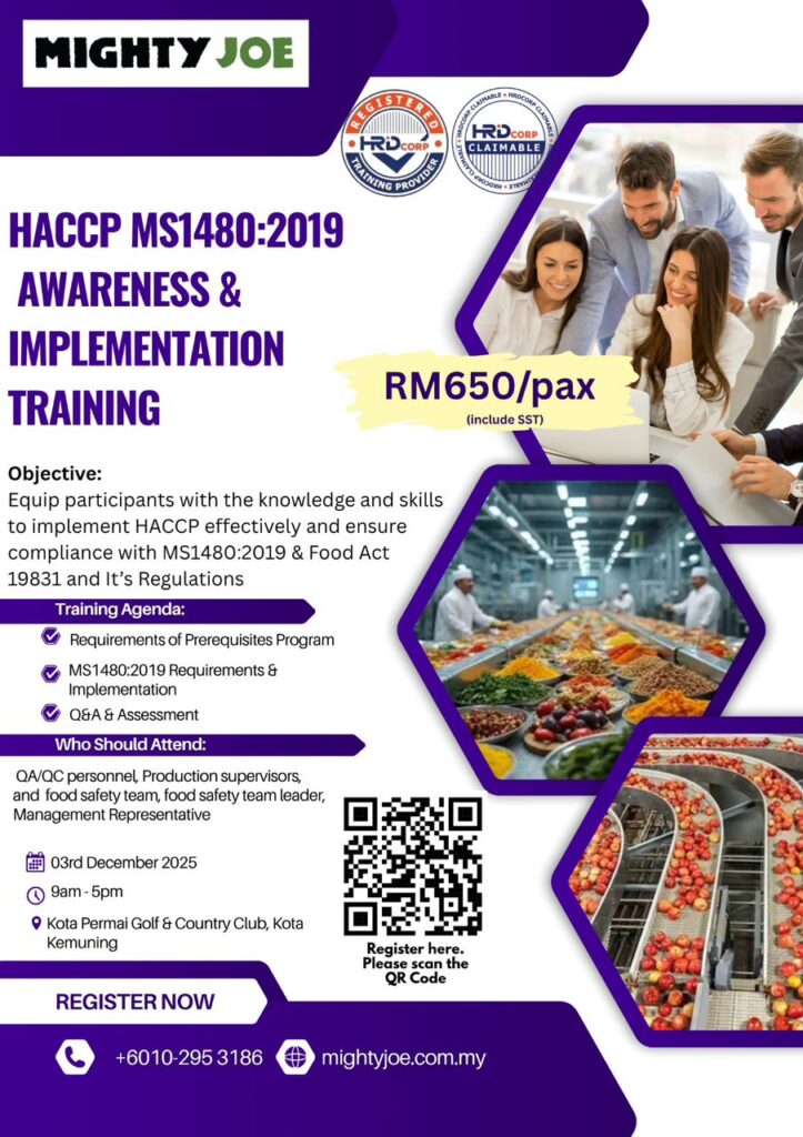 Equip participants with the knowledge and skills to implement HACCP effectively and ensure compliance with MS1480:2019 & Food Act 19831 and It’s Regulations